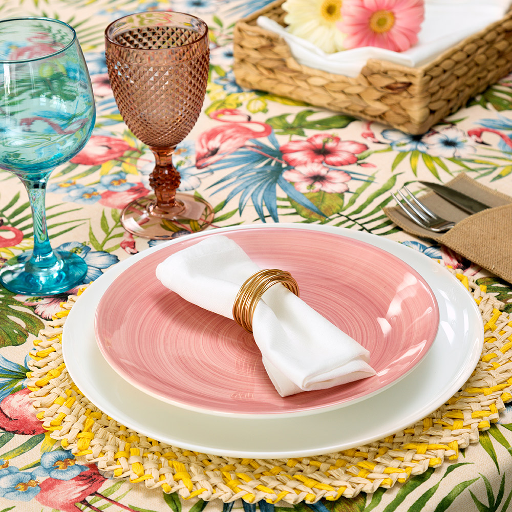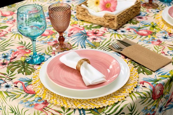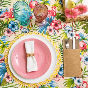 Mantel estampado de flamencos y flores. Mantel con una explosión de colores. Ideal para vestir tu mesa con estampados elegantes, decorativos y veraniegos. Mantel ligero, fácil de manejar, doblar, planchar y guardar. Mantel de tacto agradable. Mantel de tejido natural, composición 60% algodón, 40% poliester. Fabricado en España